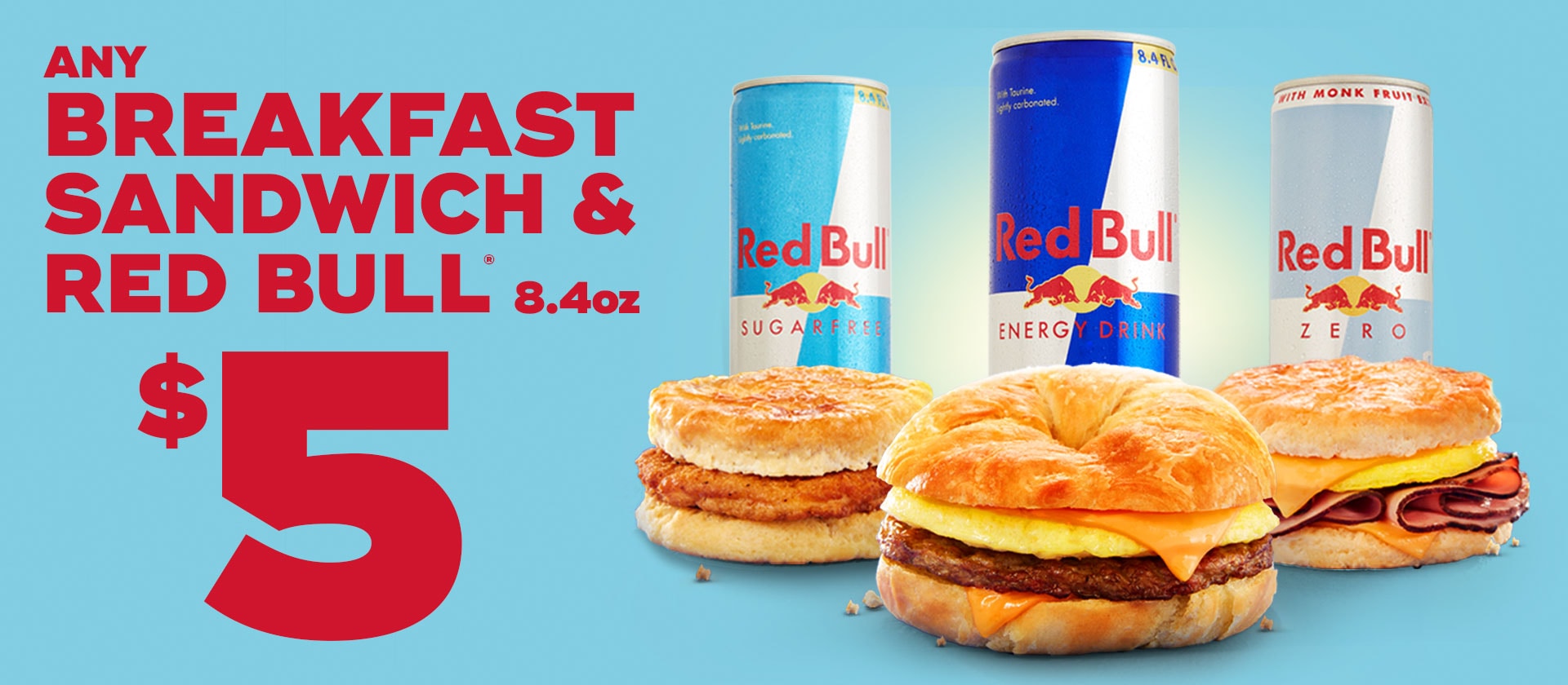 Looking for a breakfast deal so good you won’t want to hit the snooze button? Conquer your morning with a QT breakfast sandwich and an 8.4oz Red Bull® for only $5!